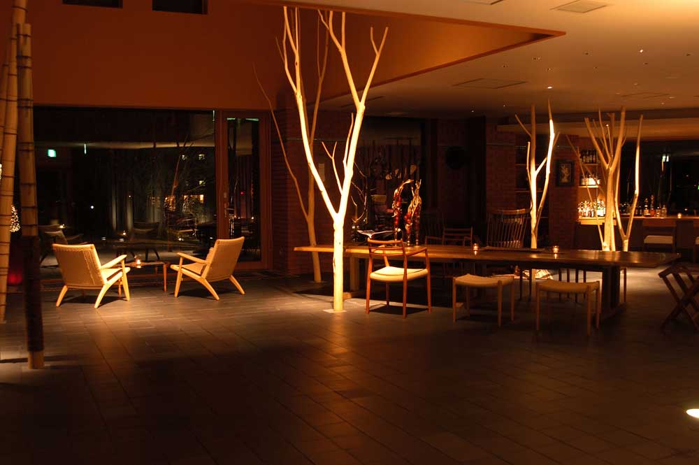 三余庵のロビーは外の自然と同じ歩みで時が進む。日が落ちると、ロビーにも同じように夜の帳が下りる。外に静かな闇が訪れる頃、ロビーは夜の森に迷い込んだかのような不思議な雰囲気。月明かりに照らされているかのような“おぼろ”な照明が心憎い。