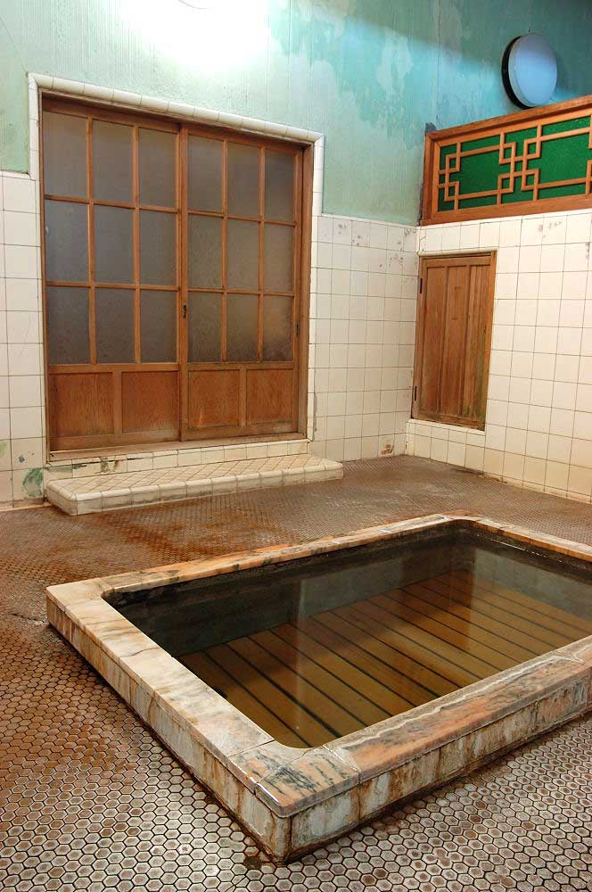 子供の頃によく行った銭湯のような母屋の内湯(貸切)。高い天井や創業当初からの湯船の縁の大理石など時代をくぐり抜けてきたその雰囲気におもわずはしゃいでしまう。なによりこの湯舟の底、スノコの間から涌いてくる湯のなんと美しい事。2人とも不思議とこのお風呂に魅せられるのでした。