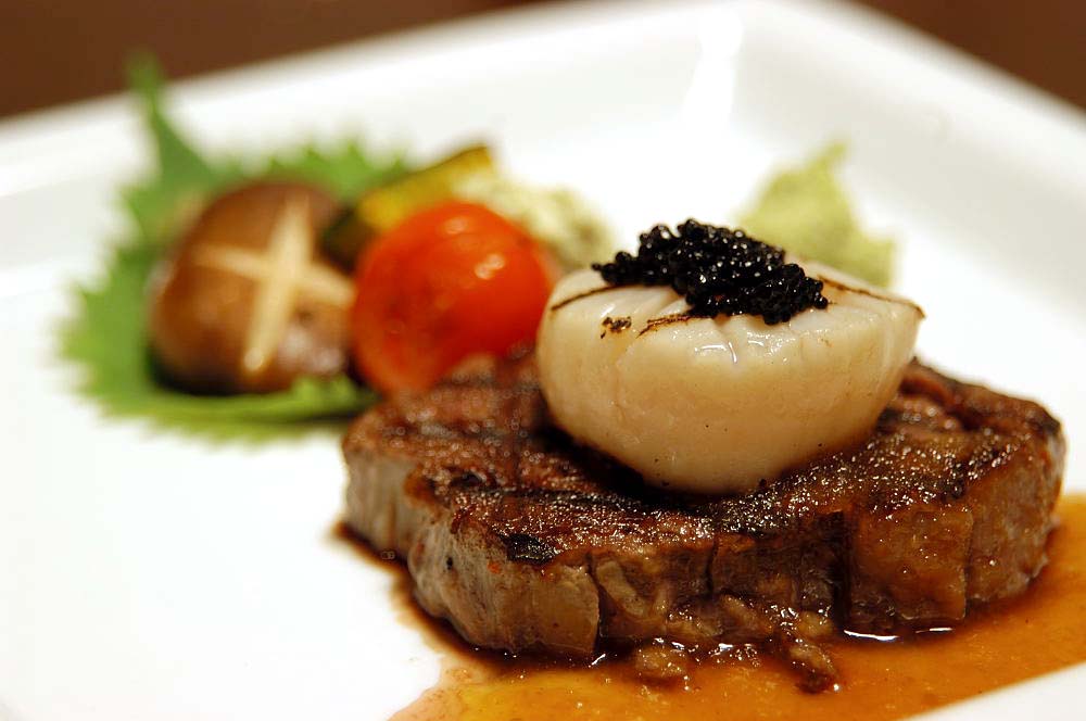 ヒレステーキには大ぶりで肉厚なホタテとキャビアが。やわらかく文句なくうまい!!