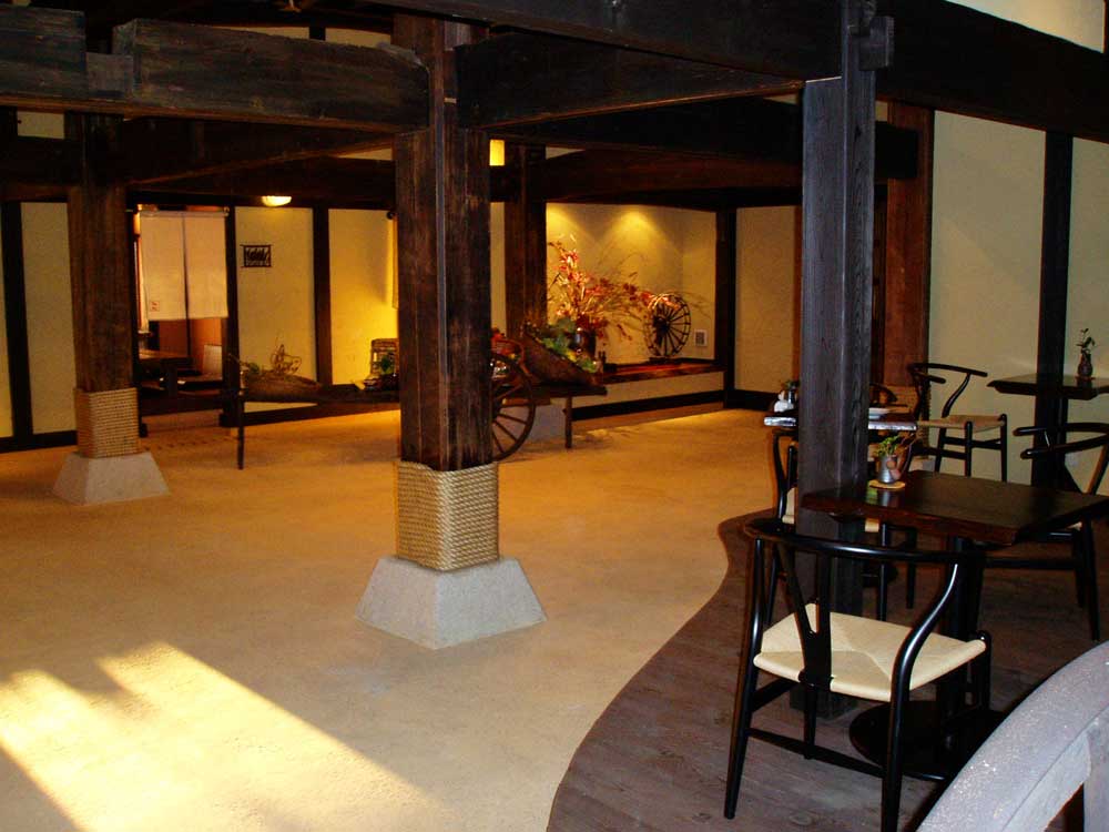 玄関を入ると正面にフロント、そして大きな梁が目に飛び込んできます。土間を彷彿させる床は洗練されたモダンな雰囲気以上に懐かしさを憶えます。