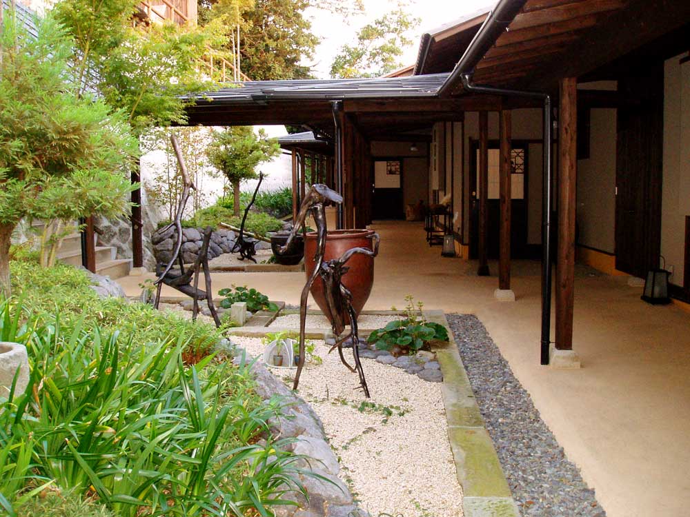 母屋から離れへ続く通路と庭には、スタッフや庵主家族の方が海岸で集めたという流木のオブジェがさりげなく置かれています。