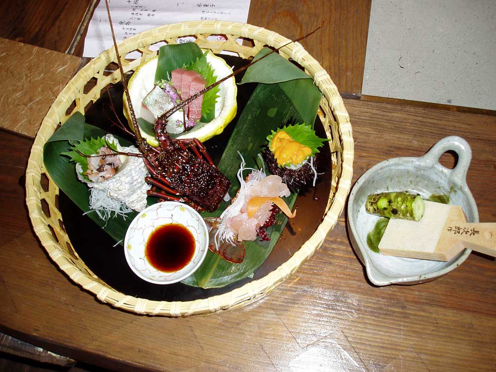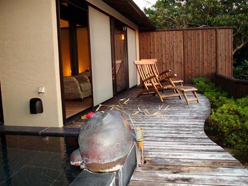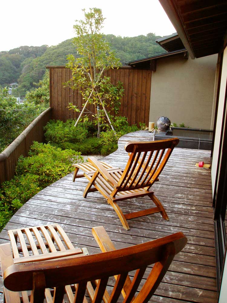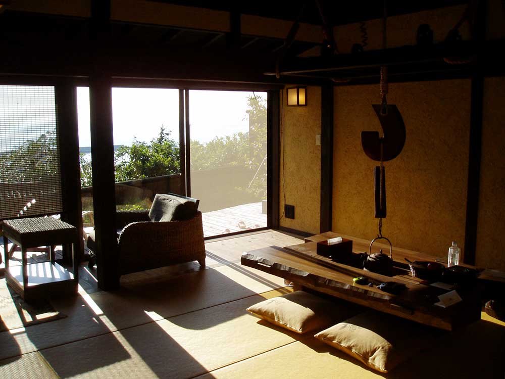 この宿の玄関を入った瞬間に幼い頃よく遊びに行った祖母の生家を思い出した。漆黒の太い古材で組まれた梁や柱、土間を彷彿させる母屋のロビーにどこからともなく懐かしさがこみ上げてくる。指定した筍の部屋に入ると木の良い香りが微かに感じられ、三枚引きの襖を開けると部屋から駿河湾の眺望が目に飛び込んでくる。部屋にはテラスに設けられた源泉掛け流しの露天風呂の他にミストサウナ付きの洗い場が面白い。また、この宿のアメニティーは化粧品からメイクブラシまで揃えられ女性には嬉しい充実振りです。この宿での過ごし方は露天風呂に浸かりワインを飲みながら駿河湾に沈む夕日を眺めるのも良し。朝はチェックアウトまでの時間を海を眺めながらデッキチェアーで日向ぼっこするのも良し。それと是非お勧めしたいのが宿のお山の散策です。恵み豊かな宿のお山は人の手を最低限にとどめ、自然のままを散策する楽しみと、春には筍、初夏には枇杷の実、秋にはみかんなど宿泊客が収穫を楽しむ事が出来ます。山の恵みはそれだけにとどまらず館内のしつらえもその季節の草花が飾られ、料理の器にもお山の竹を編んだ籠が使われたりと食事の楽しみを引き立ててくれます。無雙庵枇杷に宿泊する際には、この宿のお山番さんのblog「お山番の日々綴り」を見て頂きたい。それは宿のスタッフの無雙庵枇杷に対する思い入れが伝わってくるからです。余談ですがタビエルのサイトでお山番さんと知り合い残念ながら宿泊時に会う事が出来なかったのですが、支配人さんがお山番さんへ私が来た事を電話で伝えてくれたそうです。旅から帰った後も宿のスタッフの温かさを感じ、又、来年の夏に訪れる日を待ちわびるばかりです。