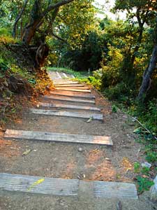 玄関から出てすぐ、入り江へ向かう森の散策路があります。孟宗竹のさわさわ谷や真竹のそよそよ道、びわ園やみかん畑が私たちの目を楽しませてくれます。人の手が入るのを最小限に留め、できるだけ在りのままで自然を残した枇杷の裏山は景色も最高です。