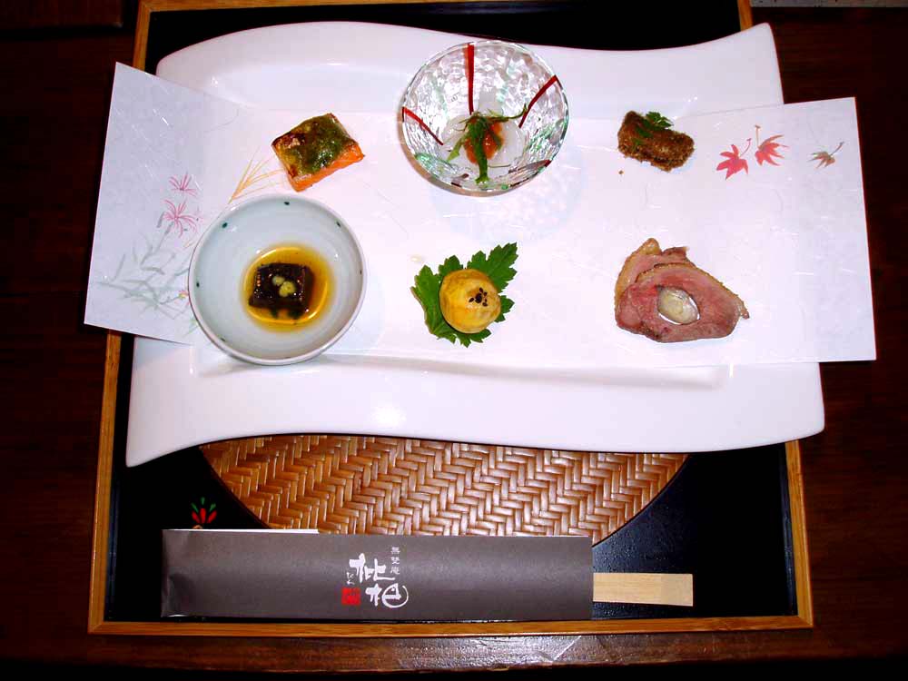 前菜の黒胡麻豆腐、秋鮭木の芽焼き、栗洋酒焼き、槍鳥賊梅ダレ、真鯛佃煮、合鴨どれも旨いのですが自分は真鯛佃煮が気に入りました。