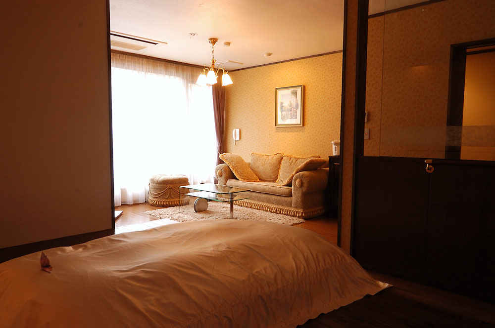 客室は渓流に面していて、すべての部屋に露天風呂が備わっている。和のテイストの中にゴージャスなソファーが置かれる。小上がりに敷きっぱなしの寝具 は上質で寝心地抜群。布団カバーはどうやらシルクのようだ。上にちょんとのっている鶴の折り紙も心憎い演出。部屋に用意された水がもの凄く旨かった。