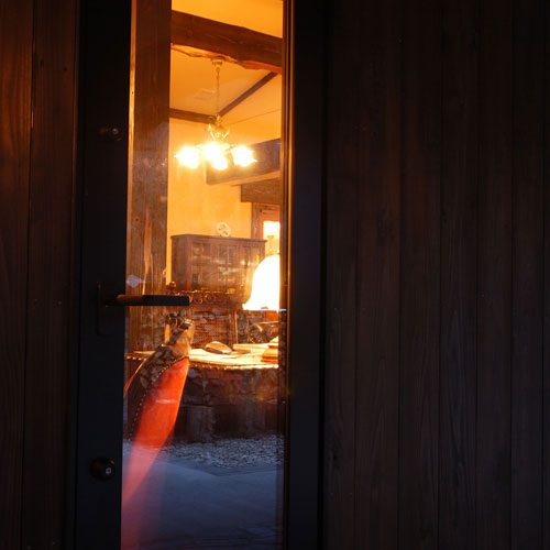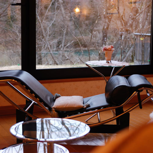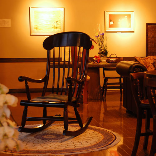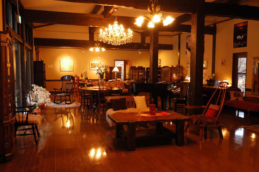 シャンデリアの下がるあめ色のロビーに松本民芸家具、和と洋が合わさりアンティークな雰囲気を醸している。調度品の数々は、女将が海外の旅先で惚れ込 んだもの。