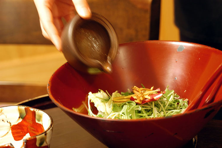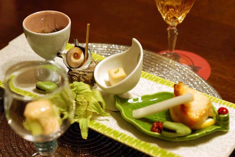前菜は水菜、ヒメサザエ、ゴマ豆腐、銀むつの西京焼きそしてふきのとうが飾られている。 ”いぶりがっこ”がしゃきしゃきサラダに妙に合うことに驚いた。