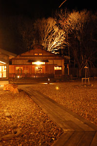 あまりに道がスゴイ道(未舗装)が続くので、「きっと道を間違えたのだろう、引き返そう。」そう思っているところに宿の看板を見つけた。「やっと到着か」と安心したのもつかの間。看板に記されているのは「あと 5km 」の文字。ひゃぁ?、今どき秘湯でもこんなに訪れる人を拒む温泉も少ない。しばらく砂利道に苦しめられていると突然、エメラルドブルーの美しい川が目に飛び込んできた。どうやら抱返り渓谷の上流に当たるようだ。これを見せられれば、砂利道への文句は撤回。渓流に沿って車を走らせると、生い茂った木々がぽっかり開け、現れたのは鄙な雰囲気ながら、リゾートを感じさせる平屋建て。待っていたのか、たまたまなのかは定かではないが、駐車場の前で女性スタッフが出迎えてくれた。ケータイ電話を見ると案の定、圏外。「都わすれ」とはよく言ったものだ。日常から別世界へと浮世から切り離された空間スリップにはむしろこれくらい秘境のほうがいいのかもしれない。
