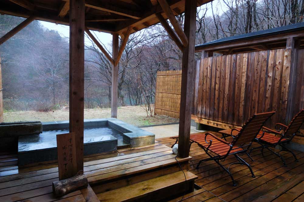 こちらは、部屋の露天風呂。目の前には抱きかえり渓谷のエメラルド色の渓谷美。9室の部屋に渓谷に面した露天風呂が備わる。ふやけた体と脳みそを、 ベンチに体を預けて脱力・・・。