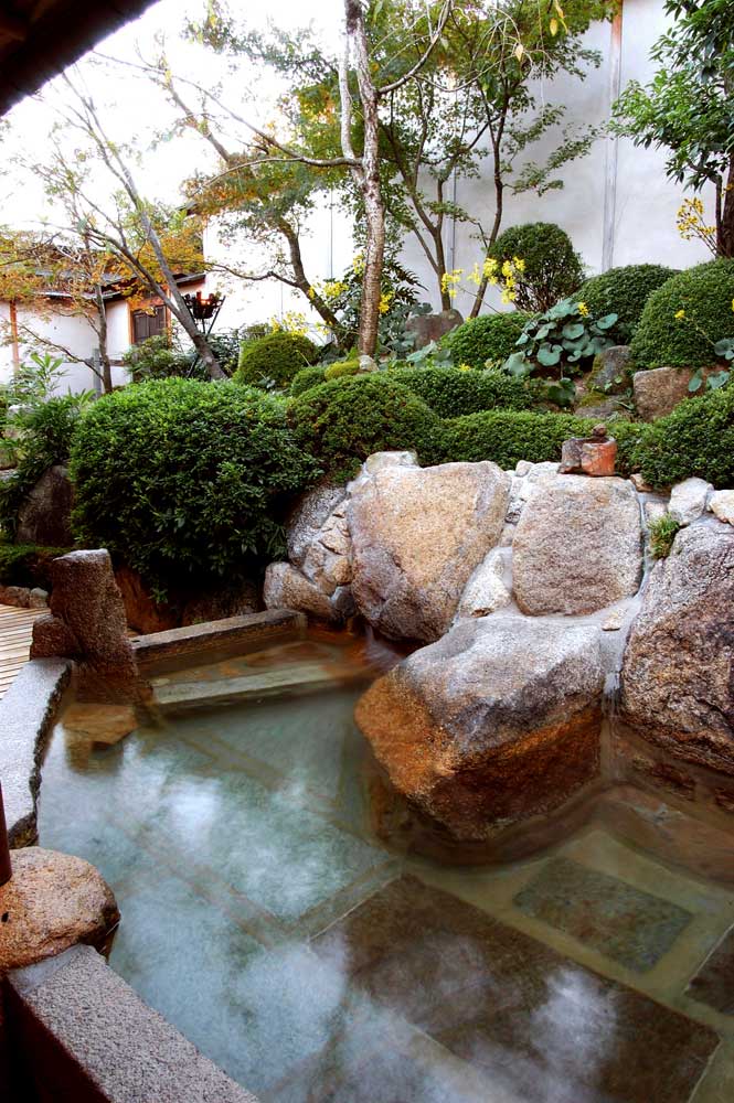 露天風呂には温度の異なる2つの湯舟。四季折々の草木に見守られて入浴する。檜をふんだんに使った内湯もある。