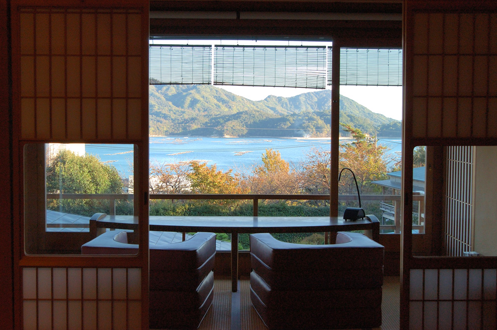 世界遺産、厳島神社を有する安芸の宮島は、神が宿るとされる信仰の島。石亭の庭から見るその島は他の小 島とともに青い瀬戸内にぽっこり浮かんでいるように見え、近くで見るのとは少し違う表情を見せてくれる。