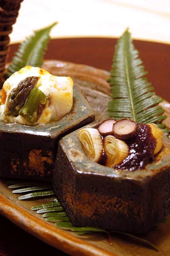 なんといってもこの宿は美食の宿として知られているわけです。この宿の名物、牡蠣の六角焼。六角石の小鉢の中でぐつぐつ煮えながら運ばれてきたのは名 物の六角焼。牡蠣の柚子味噌かけと、黒鯛のホワイトソースの二種。亭主が考案したこの宿の人気の一品