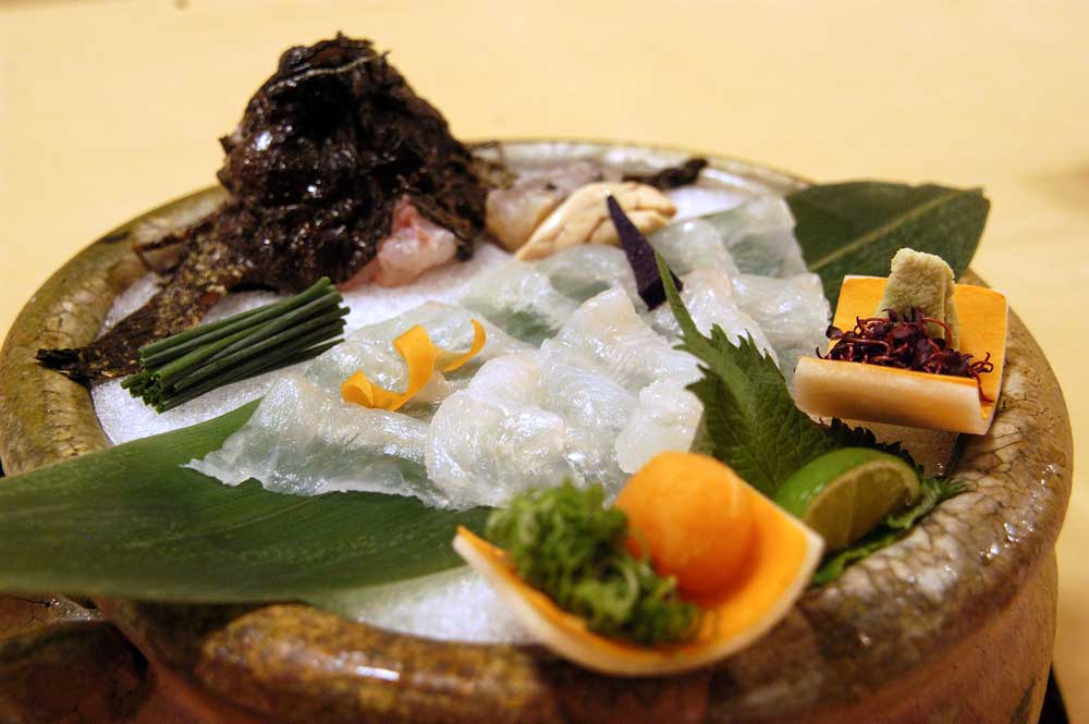 別注文のオコゼの薄造りをオーダーしました。見てくれの酷い魚の中には、その見かけとは似ても似つかないような、上品な味の魚がある。見かけからは想 像もできないような、透き通るような白身。あさつきを芯に巻いて、ポン酢をほんの申し訳程度つける。その繊細な味を追いかけて、キュッと噛みしめるとほの かな甘みが漂いだす。肝はバターのようにまったりと。皮のにこごりはゼリー寄せに。上品な脂がたっぷりのっているからこその品。
