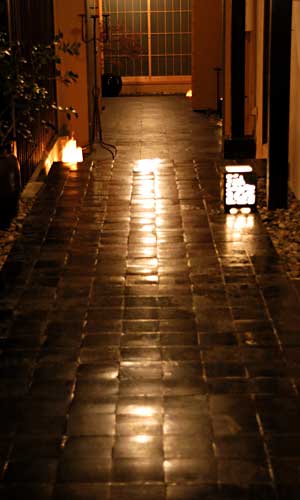 センスのいいパブリックスペースが敷地のあちこちに。日中でもほの暗い通路、漆黒の敷き瓦が足元灯の明かりを受けて艶っぽく光る。旅館の通路とは一味 違う、どことなく路地裏を歩く風情。家庭から消え去ってしまった陰影がここには残っていた。