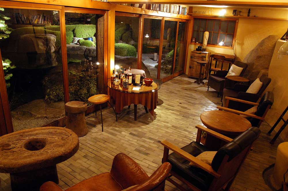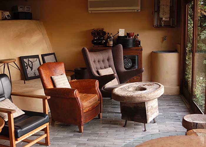 もともと岩場だったところをくりぬいてつくった天井の低い隠れ家のような床下サロン。古いものから新しいものまで椅子が数脚置かれ、ここに腰を下ろせ ば何時間でも過ごしたくなる場所。洋酒類もおいてあるから、酒好きならば尚更のこと。