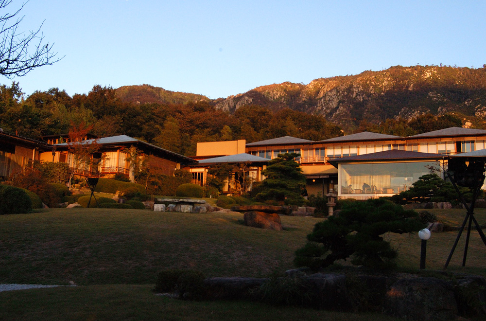 日中の陽光、夕刻、篝火とライトアップそして朝日を受けて浮かび上がる棟棟(写真)、石亭の姿は時間とともに刻々と変化していく。背後には屏風のよ うに切り立った経小屋山。その山裾は、石亭の庭へと続き瀬戸内海へ向かう。もちろんその先には宮島が横たわる。素の自然が仮想の自然を飲み込んで生まれる 壮大なスケール感は圧巻。