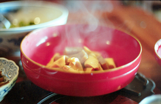 大きな溜塗りの朱鉢に、湯気立つ細い竹の子とこんにゃくが盛られて登場。火を通すものは、すべて作りたてが食卓にのります。宿での朝食に一時間半たっぷりかけるなんて、今までにないことでした。それくらい食材が豊富なのです。