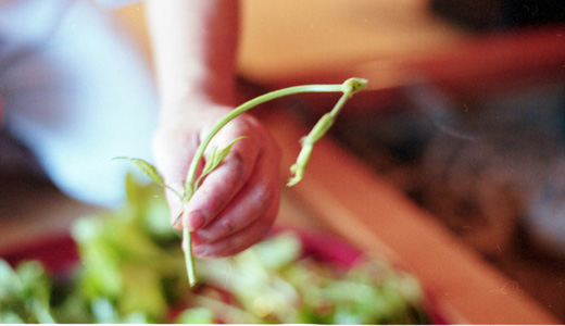 お盆に盛られた山菜を一つ一つ説明してくださり、そのあと刺身や天婦羅になって登場です。なんと豊かな食材だこと!蕎麦打ちはお母さんからの伝授で、新海さんが仕込むようになったそうです。蕎麦はもちろん栽培からです。