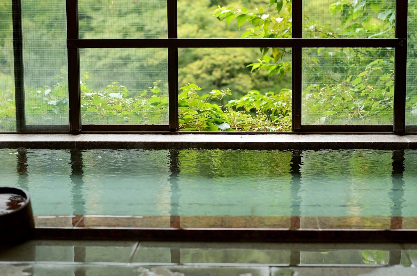 広くはなく、目立った特長もないのだが、対岸の緑の山を正面に見て湯に浸かっているとなんだかいい気分になってくる。お尻に感じる若草石(たぶん)も心地いい。遠く下のほうからは川の音が聞こえ、少し開いた窓から入ってくる風はすこし秋を感じさせる。