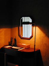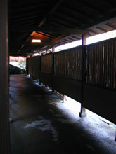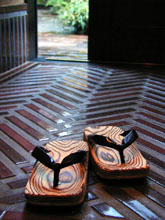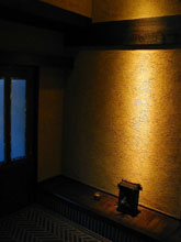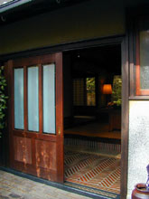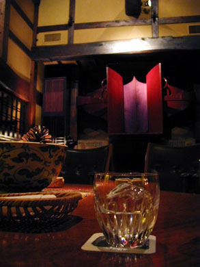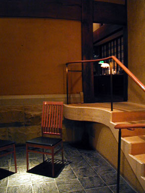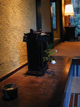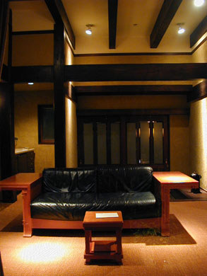 前庭を通って民家を移築した館内に入ると薄暗い空間でした。今度はスーツ姿の従業員が迎えてくれます。フロントやお土産コーナーや椅子があるのでここ はいわゆるロビーなのでしょうが、こんなに洗練されたロビーは初めてだったのでドキドキしました。