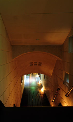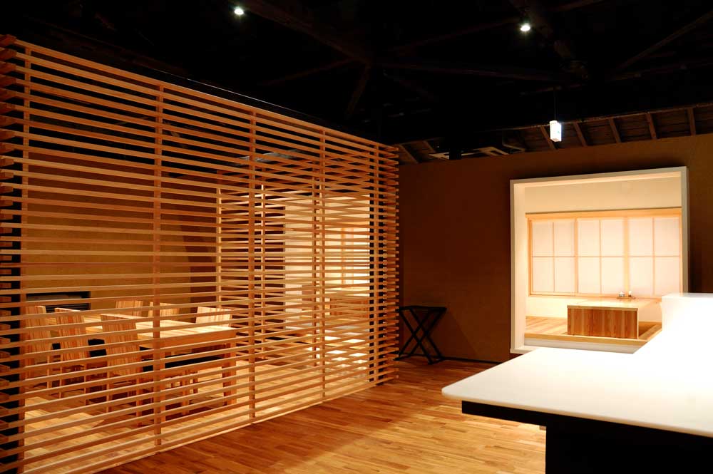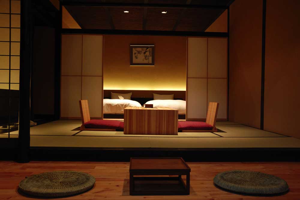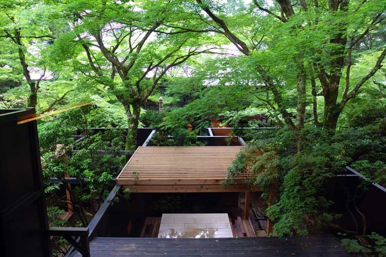 部屋にいるとこれが森林浴気分。この静けさ、包み込むような木々の緑。避暑地にうってつけですね。棟棟をつなぐ渡り廊下ら見える 緑にも癒される。敷地内を古道が通っていたりもする。その古道は歴史的価値があるため、渡り廊下はそれをよけるようにいったん地下にもぐってまた地上へ現 れる。箱根でも一、二の老舗旅館をおおきくリニューアルするには相当の覚悟と決意があったに違いない。都会的なテイストのダイニングや最先端な和モダンの 客室など、時にはハラハラするくらい意欲的。でも古いものをお払い箱にしたわけではないようだ。実際、旧家の別荘風の部屋も健在だったり、古い建材などが 姿を変えて活躍している面白さがある。なによりベースは木造の宿。建物が生きている感じがする。