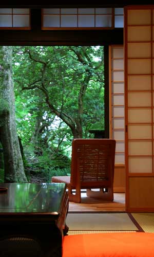 宿は豊かな木々に囲まれ、森林浴気分に癒される。左下は若旦那がどうしても造りたかった囲炉裏の談話室。