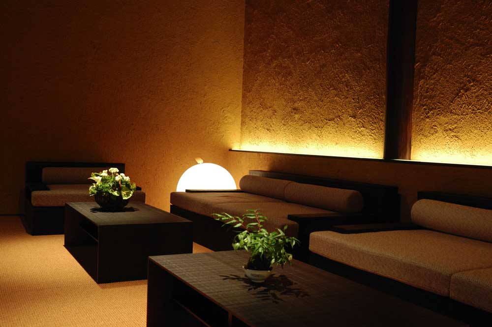 コの字形の通路が、外界との遮断された雰囲気を演出。帳場を抜けると中庭に向かって開ける視界、わらを塗りこんだ土壁の和モダンなロビーはこの宿のセンスを感じさせます。