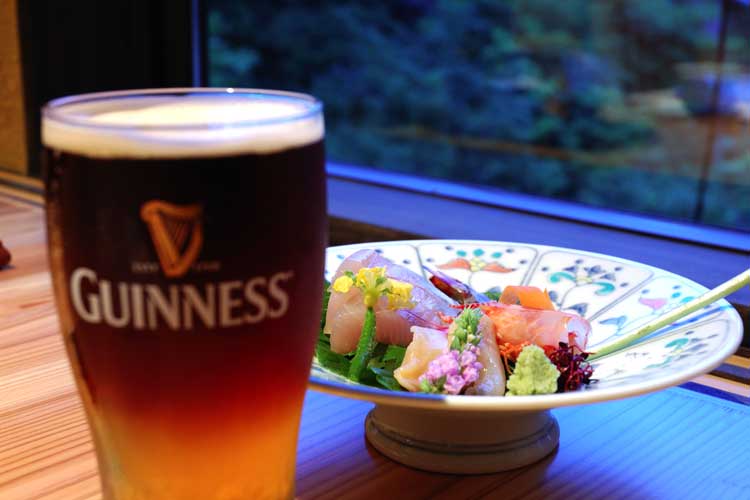 3種類の中からアジとキンメダイをオーダー。エビスとギネスとのコラボで生まれたオリジナルビールがあるというので、迷わずオーダー。2層に分かれた生 ビールと黒ビールの生み出す色味の深いグラデーションがゆっくりゆっくり色合いを変えていく。ロマンティックだ。「箱根の夕暮れ」ナイスな命名だと思う。
