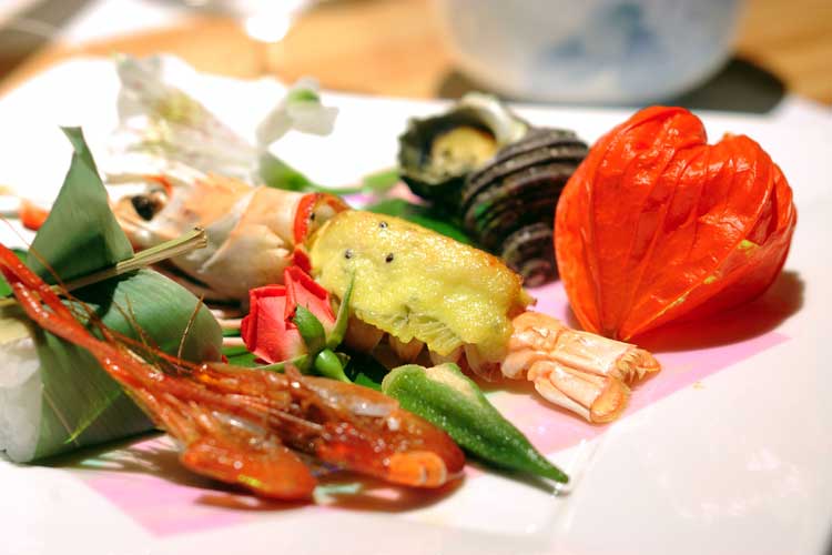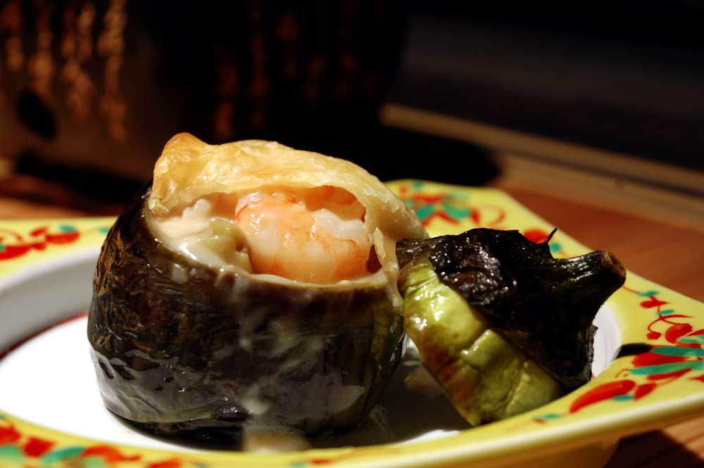 赤座海老の緑焼き、姫サザエはエスカルゴ風にたしかガーリック風味だったと記憶している。ほおずきの中にもお楽しみが仕掛けられてますよー。種明かしはやめときましょ。