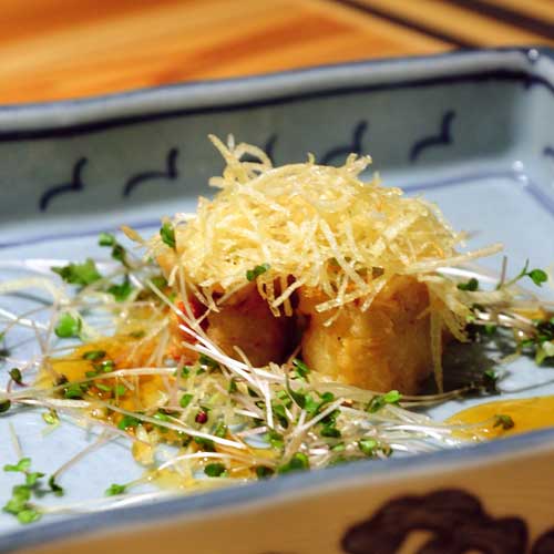 太刀魚は巻いて甘酢餡で味付け。千切りに切ったジャガイモを揚げたものがのって繊細な舌触りと香ばしさを生んでます。