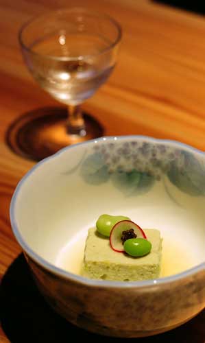 前菜はから赤座海老の緑焼き、姫サザエはエスカルゴ風にたしかガーリック風味だったと記憶している。ほおずきの中にもお楽しみが仕掛けられてますよー。料理人の動作をみながら食事するのもまた楽しい。迷わずオーダーしたオリジナルビールもウマ!