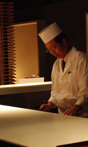 ダイニングはとっても都会的。オープンキッチンで料理人が仕事をしているのが見えます。自分たちのブース?に入る前にこのオープ ンキッチンで造りにする魚をお選びくださいとのこと。目の前には料理人。この人と相談しながら選んだりすればスマートで楽しいんだろうけど、人見知りなわ れわれは「どれにする?」と内輪でぼそぼそ相談しながら