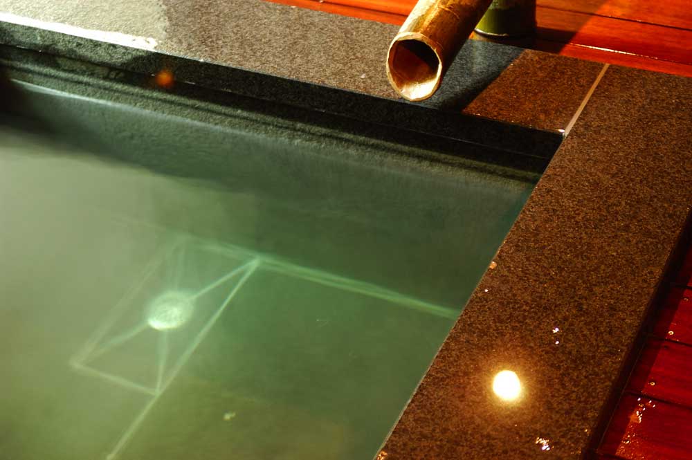 さて、まずは大浴場へ。浴槽が2つあって、そこに一切混じり気のない、温泉が湯船に注がれるそうです。「湯の表情」と評する人がい るほど、お湯の色はその日その日で違うらしい。乳白色に白濁するときもあれば、淡い緑のときもあるし、二つある浴槽のうち一方は白でもう一方は緑と言うこ ともあるようだ。お湯が「生きてる」感じがしますね。温泉通に言わせると、美しいエメラルドグリーンに出会えればラッキーらしい。ちなみにこの日はどちら の浴槽も乳白色に白濁した湯でした。