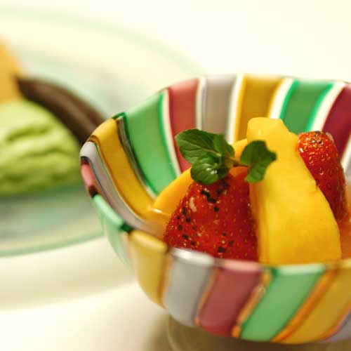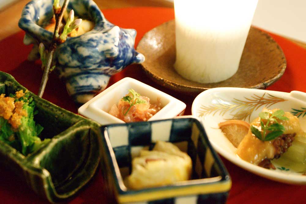 さて、宿好きの語り草になっている御宿かわせみの絶品料理。灯りを落とした部屋に、ろうそくを灯してお料理を浮かび上がらせるという演出で前菜が登 場。食材が素晴らしく、味付けが素晴らしく一品食べるごとに気分が高揚していく