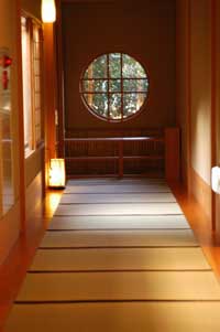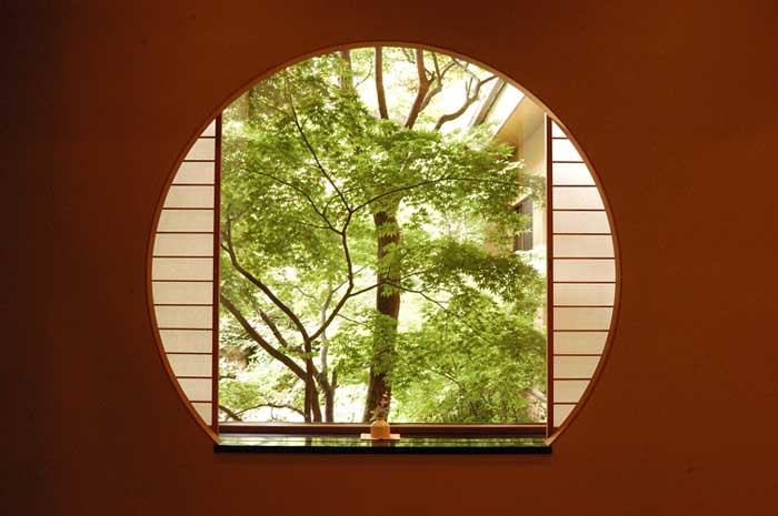 部屋に案内されると、池を彩る緑が窓に映し出されている。思わずため息。窓から射し込む光線は、竹林と木々と障子にさえぎられ畳の上ににおだやかな陽 だまりをつくる。物音一つしない。(客室は侘介)