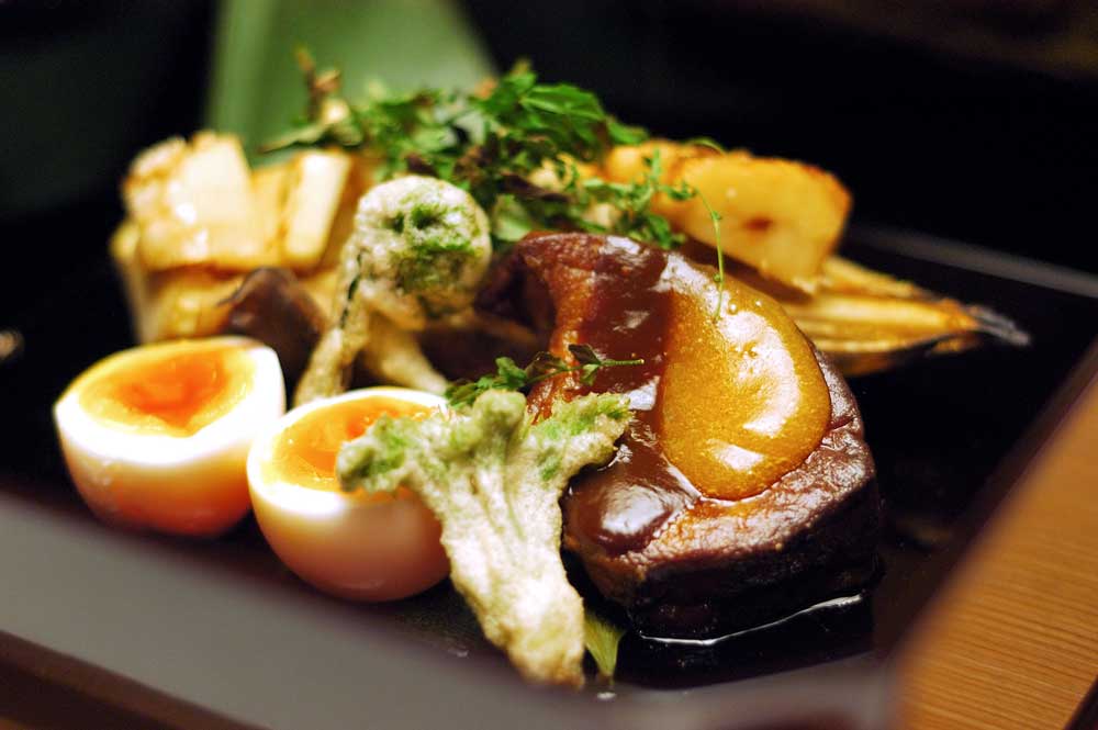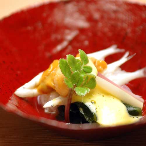 われらの魂さらっていった珠玉の一皿「朝掘り筍の土佐醍醐焼きと フレッシュフォアグラの八丁あんぽだれ 烏骨鶏のレア玉子をそえて」。濃厚なフォア グラは八丁味噌のあんぽだれと出会い、今まで食べたことのない禁断なときめきをもたらす。焼きを入れられた筍は、風味が閉じ込められてある。思わずもれる ため息。「これてよかったぁ?」と泣き声の連れは、次の瞬間には「こりゃ、ビール進む」と手酌酒。