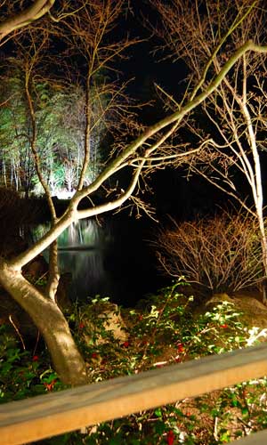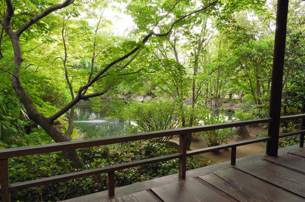 縁台にでると広大な敷地の木々を住処とする野鳥のさえずりと、池に流れ落ちる小滝の音が清涼感とともに静かに聞こえているだけ。