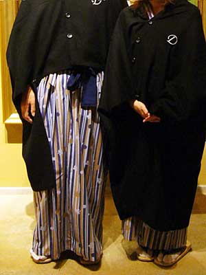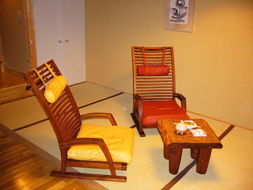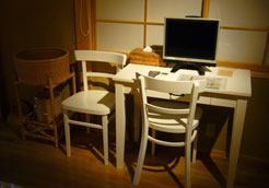 やさしいあかりと木の香りに包まれた部屋は二人で過すには十分な広さ。ユニークなウッドチェアとテーブル、そしてさりげなくシモンズ社製ベットを備え、素朴なしつらえながらも良質な山荘である事を主張する。右下はだいこんの花オリジナルのポンチョ?(カシミア製で着方が面白い)