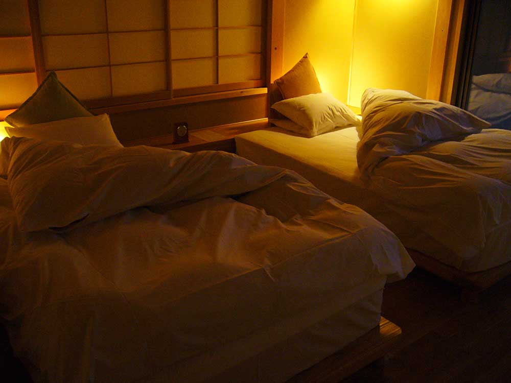 渡り回廊からは敷地の景観を損なわぬ様配慮したという、自然林に溶け込む様に建つ高床式の家屋が見える。荷物を持つスタッフと会話を交わしながら、本日の部屋「蔵王連峰を望める」というメゾネットタイプの“えぼし岳”に到着。
