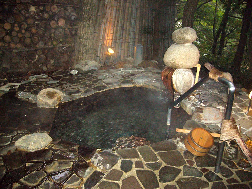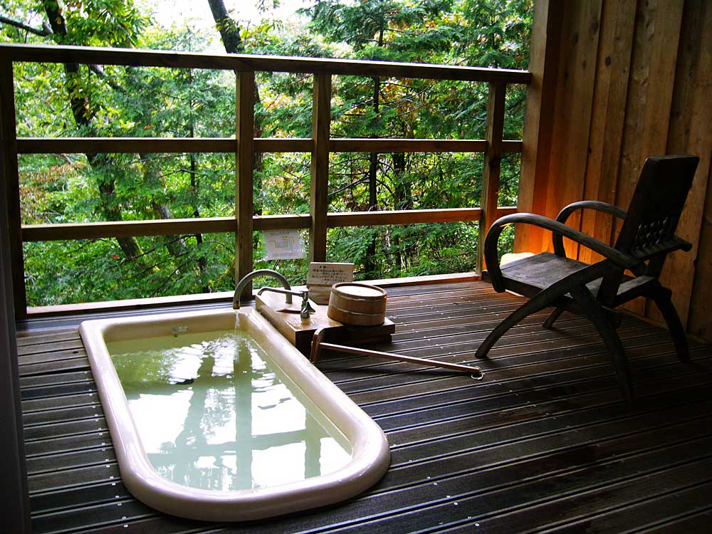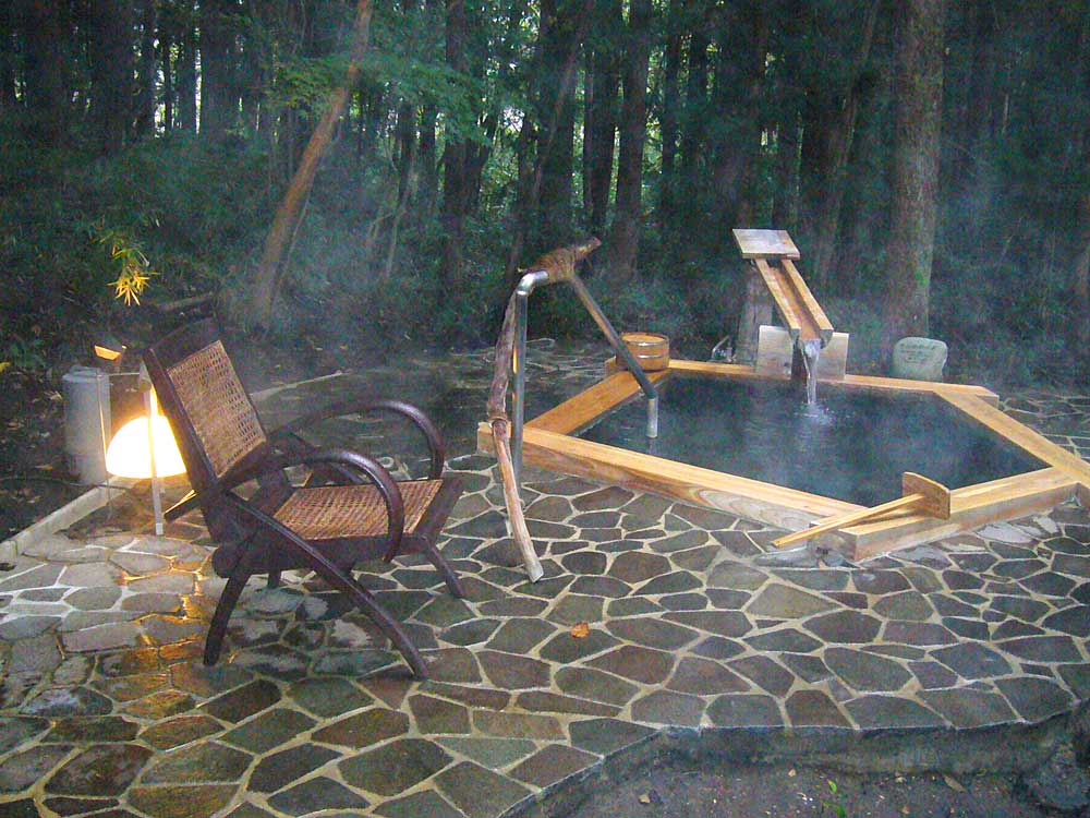 2階のベランダには、加水,掛け流しの温泉がチョロチョロ流れる一人サイズの半露天風呂が備わる。(部屋によって趣が異なる)新鮮な空気の中、緑の木々を眺め、濁川のせせらぎをBGMに浸かれば、時の経つのを忘れてしまいそうだ。思わずここで暮らしたくなった。