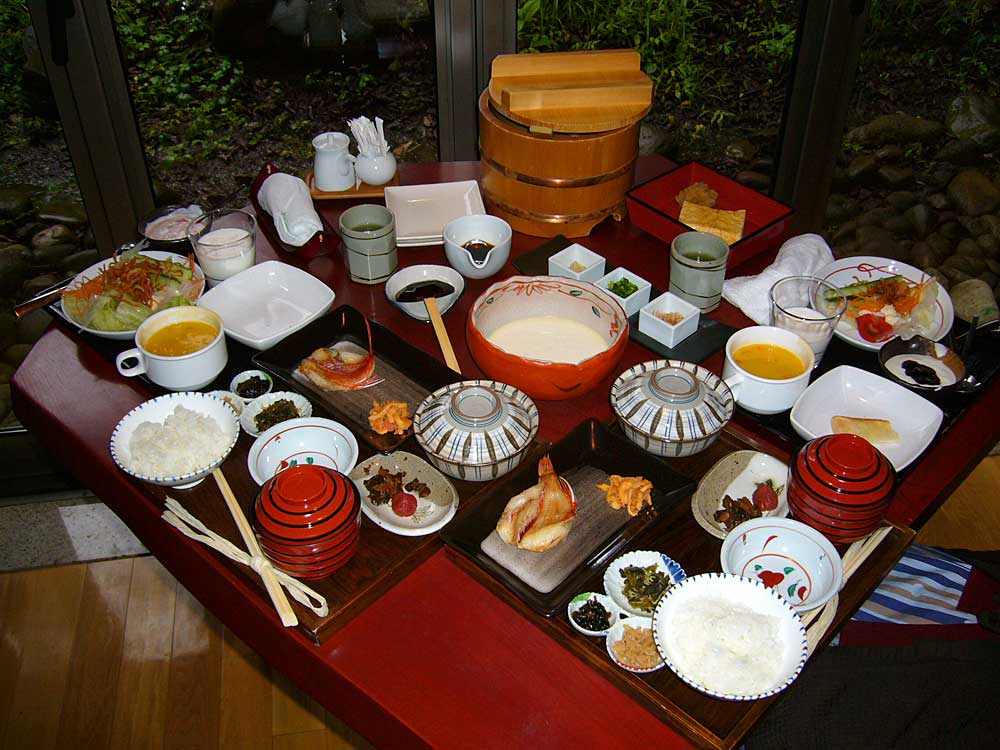 朝食も母屋のダイニング“コの字”で。洋食をバイキングで選び終えると和食膳を持ってきてくれる。みずみずしい朝摘み野菜、蔵王の乳製品、郷土色を感じる和食膳、中でも手作り豆腐と厚焼き玉子は美味で、結構なボリュームながら完食した。