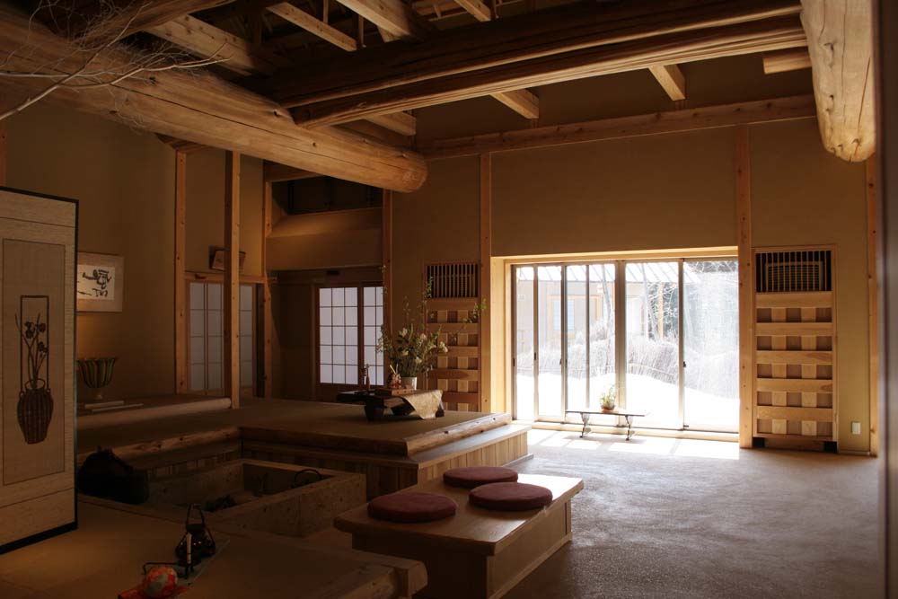 “温泉山荘 だいこんの花”はみちのくの名峰、蔵王連山を望む絶好のロケーションにある。緑に包まれた駐車場の奥に立派な母屋が佇み、それとは不釣合いな自動扉の玄関の奥には、仄かに炭の香が漂う素朴なしつらえの力強い空間が広がっていた。
