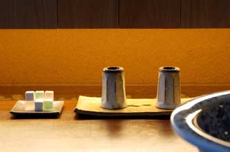八ツ三館の食事処はすべて個室で、窓から見える庭園には蝋燭を模したかがり火がたかれ、雰囲気が大変よろしい。通された食事処は奥まったところにあり、まるで隠し部屋みたいだ。古い茶室なのだろう。雰囲気は今までの中で一番かも。室の入ると照明は落とされていて、テーブルの上に手作りの和蝋燭の炎がゆらゆらゆれている。