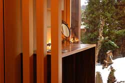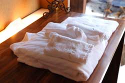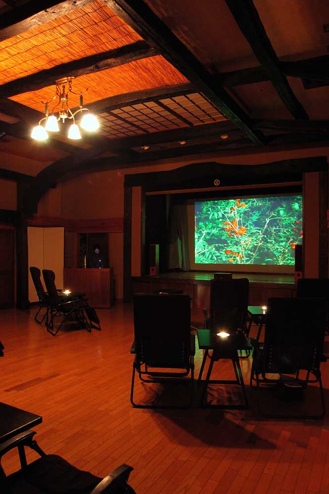 お湯にお濁り酒がすこし混ぜてあり、湯船に浸かっているとホンワカとお酒の香りが立ち上ってきていい気分。風呂上りにシアタールームとリラクゼーションルームでレモン水を飲みながら完全脱力した後はいよいよ食事の時間。