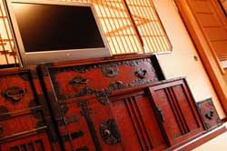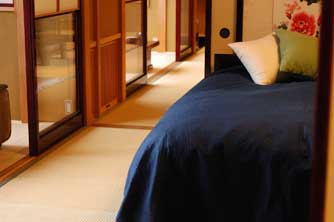 ひろーいリビングは(15畳くらい+広縁)、ベッドルーム(8畳くらい+広縁)、囲炉裏の間(4畳半)、荷物おきや着替えの部屋(6畳)、お風呂の手前部屋(6畳を脱衣所代わりに!)、そして広縁の向こうには手入れされた小さな庭。その向こう側にはお寺の屋根が頭を覗かせています。