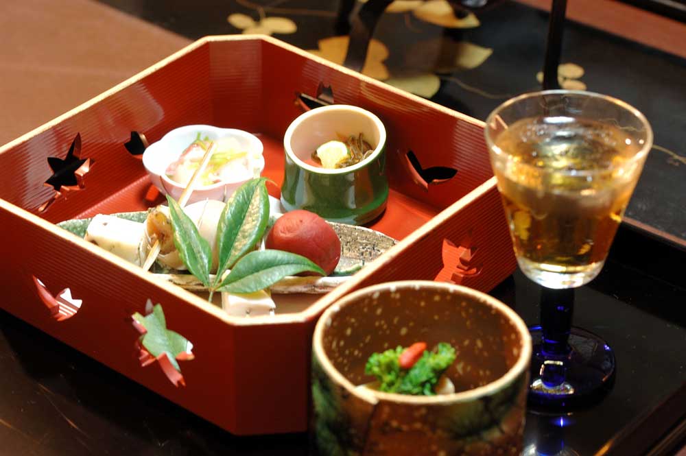 食前酒はあんず酒で夕餉がスタート。ほぼ一品づつ運んできてくれる懐石スタイル。