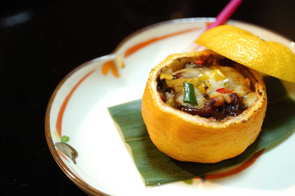 こちらは柚子釜焼でくり貫いた柚子に鰤がありチーズと唐辛子味噌で味つけしてある。