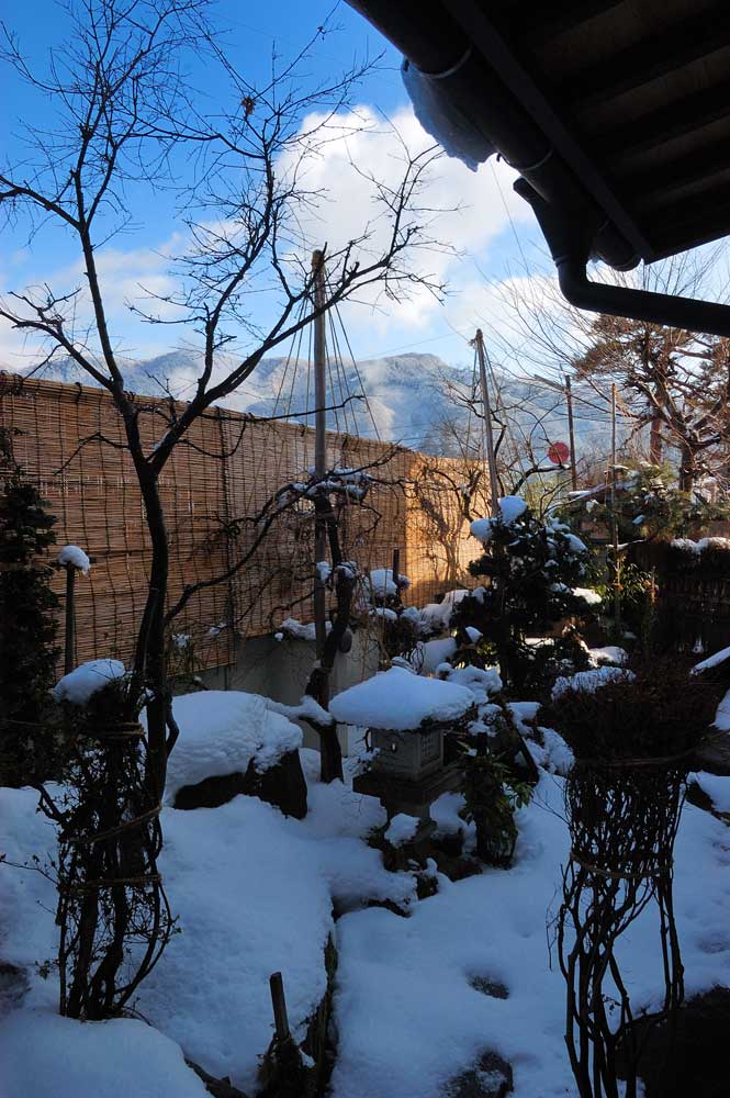 聚楽の間の居間からは見える庭園は広くはないが、木々たちがちょこんと雪をかぶった姿がかわいらしい。