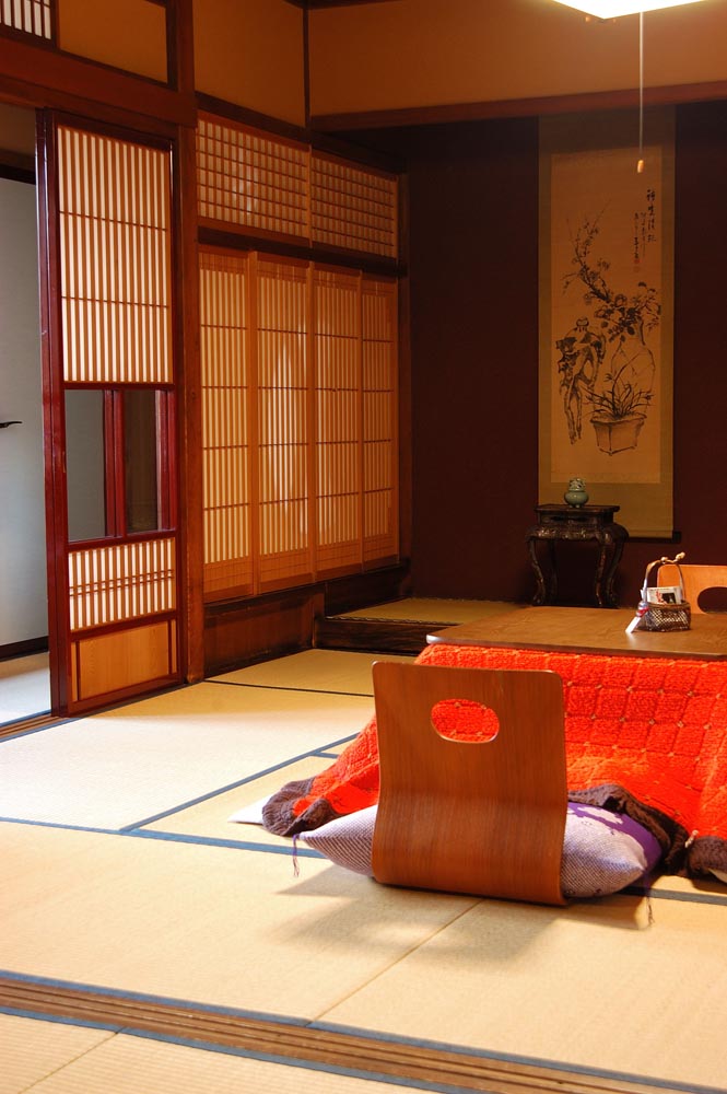 部屋に入ると、飛騨の山並みを背景に荘厳なお寺の屋根がそびえる。本館は明治の館。必要な部分は手が入っているので、古さは不便さにつながっていない。ただし木造ならではの音と振動も味のうちという心のゆとりは必要。一方の新館には囲炉裏の間もあり、快適さは申し分ない。