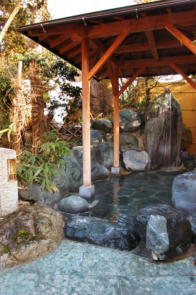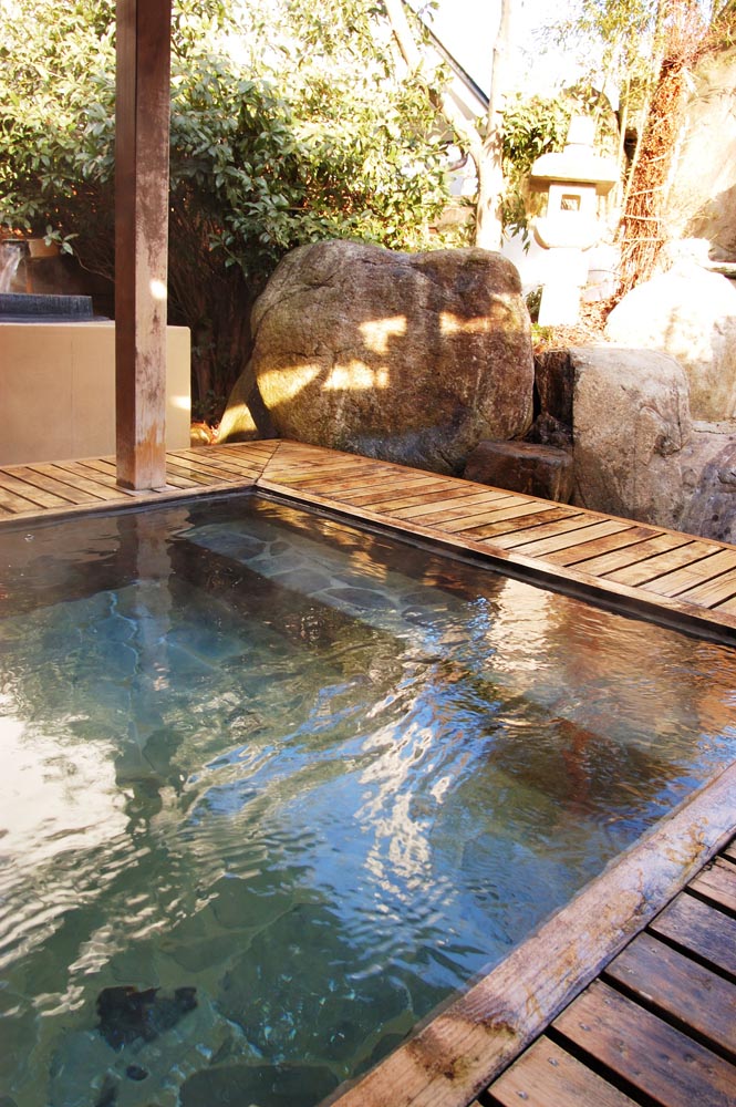岩と木々を配した庭園に望む露天風呂。温泉地ではないものの、近くの桃源郷温泉から運び湯している。この湯はアルカリの湯らしく、肌がつるつるするのがうれしい。